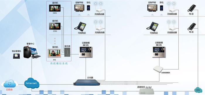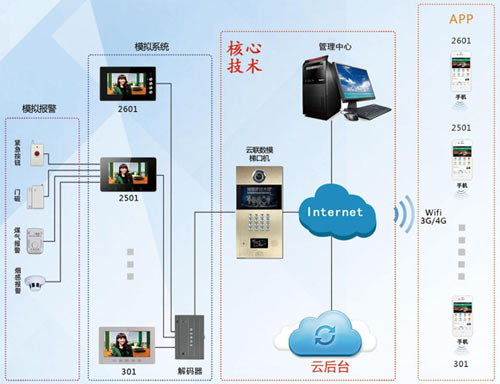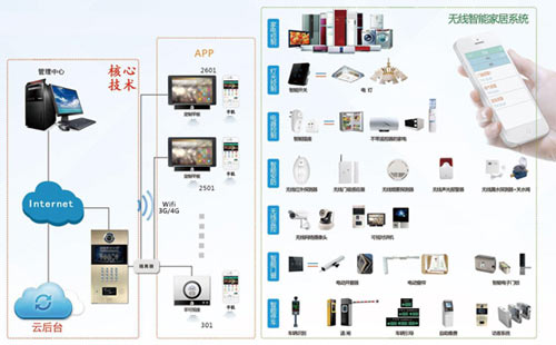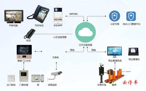以智能门禁、智能停车为入口,以APP开门为工具,以云后台为中心,以社区运营为平台集成对讲门禁、监控、智能家居、数字物业、O2O等为居民提供增值服务。并可以拓展办公楼宇、访客系统、居家养老院综合解决方案。