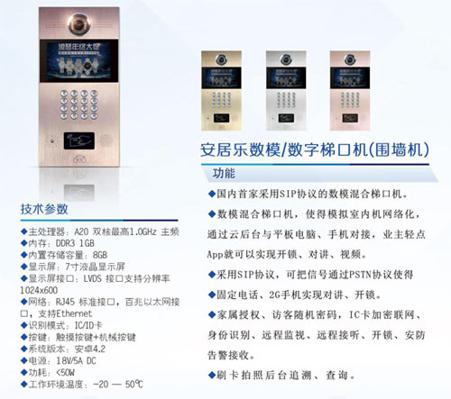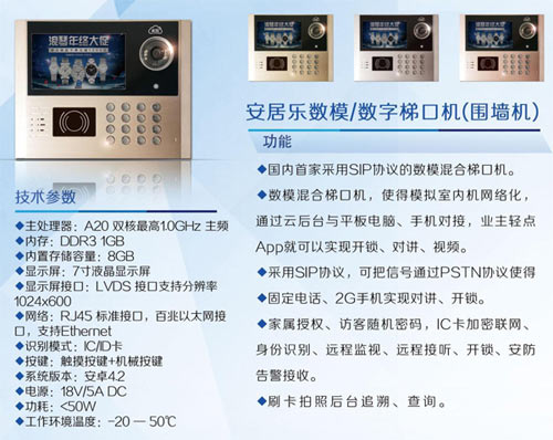 安居乐数字对讲系统把模拟信号和数字信号融为一体,安居乐数字后台搭建业主、物业管理、周界商圈、广告经营、O2O的大数据交流平台,充分发挥各自优势资源,共同营造增值空间,体现各自社会价值。让用户切身体验到:"家就在眼前,社区就在身边,世界就在指尖,生活就在安居乐。"