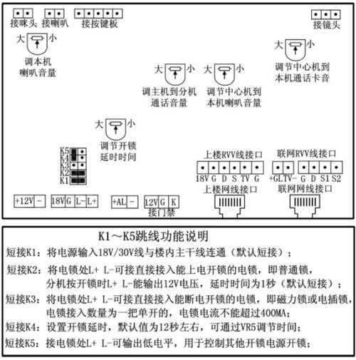 注:主机默认是接电控锁,如果是接磁力锁,须把K2插帽拔掉,然后短接K3 和K4插帽,这样是通过调节VR5来设置开锁时间,也可以只短接K3,然后通过在主机上输入#00002002+XX来设置开锁时间。