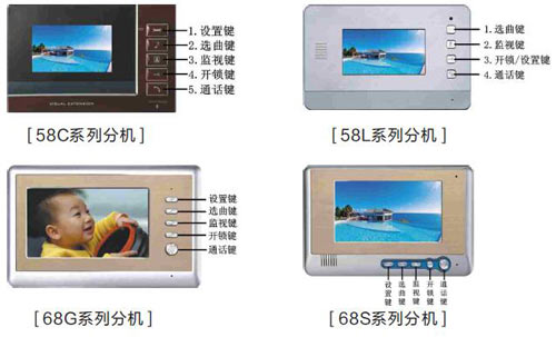 在待机状态下按两下“设置”键,分机进入色度设置界面,分机显示当前的色度参数,按“开锁”键,降低亮度,按“监视”键提高色度;