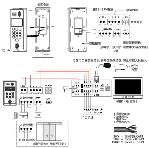 门口机功能: 可接室内机, 可实现呼叫、视频传输、双向对讲、开锁功能。