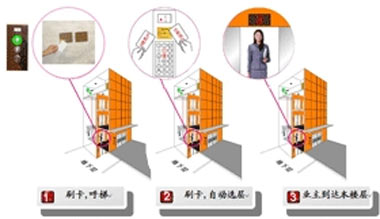 楼宇对讲系统“电梯控制器”采集每户对讲分机的“开锁”按键信号,并提供通信协议,实现楼宇对讲系统与电梯楼层控制系统的通信;电梯楼层控制系统从“电梯控制器”上获取业主的楼层信号,使该层的电梯按钮在电梯开门后一定时间内可以被登记,访客进入电梯后按键即可到达相应楼层。