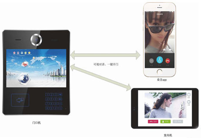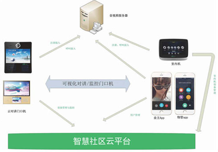 采用“云对讲门口机+云平台+音视频平台+室内机+业主app+物管app”的系统架构